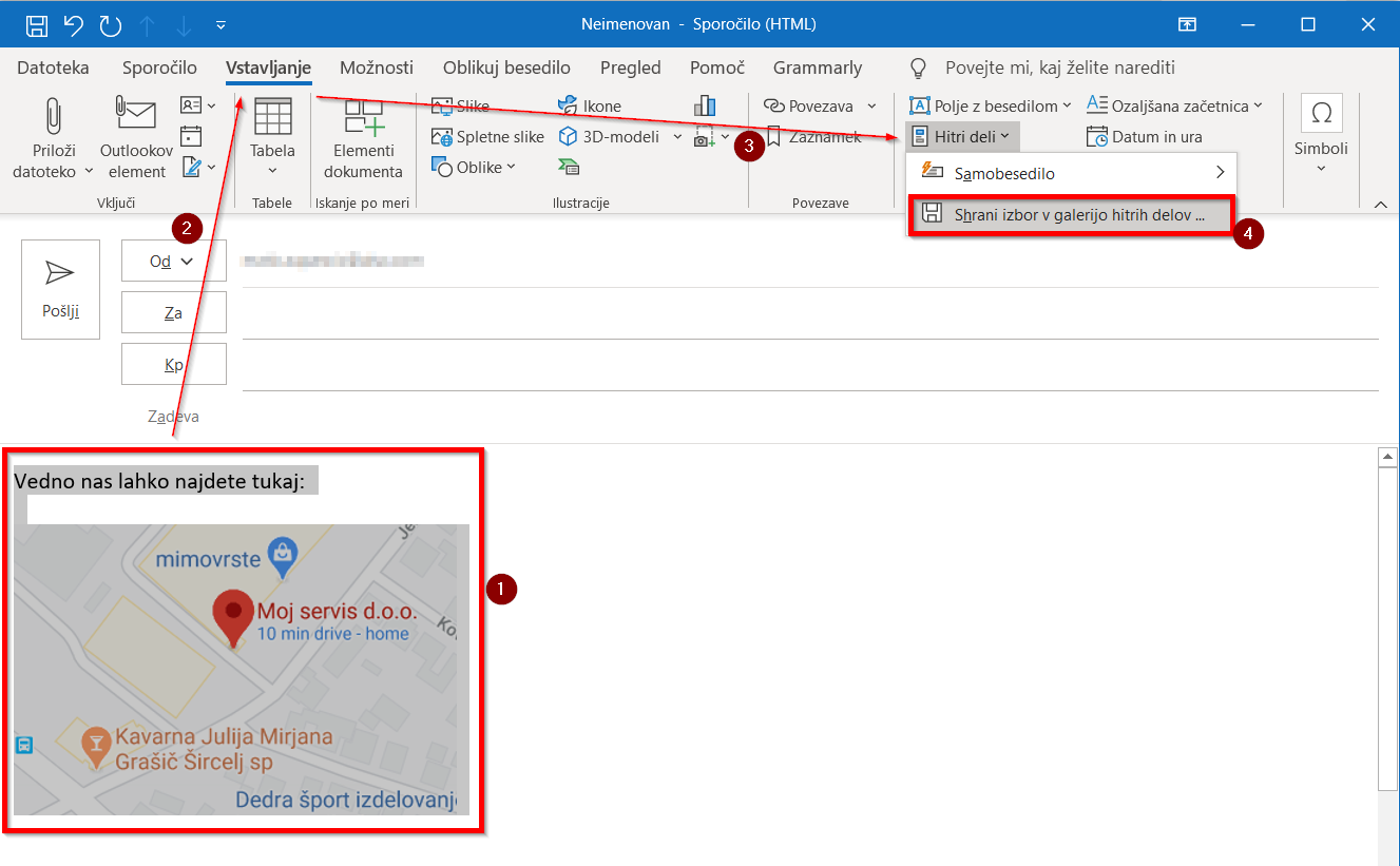 Najprej napišemo besedilo, ki bi ga radi spremenili v “hitri deli”, nato ga izberemo, v zavihku Vstavljanje najdemo izbiro hitri deli in dodamo. Enostavno.