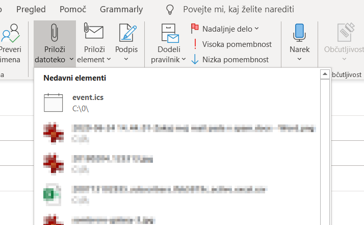 Zdaj je Outlook že sam dela seznam datotek, ki smo jih v računalniku nazadnje urejali oziroma shranili. Ta seznam je na voljo že takoj, ko pritisnemo ikono za priponko in s tega seznama lahko res hitro izberemo ustrezno datoteko, ne da bi morali poznati natančno pot do nje in jo iskati po drevesni strukturi dokumentov.