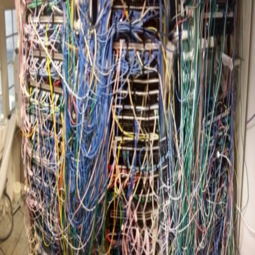 Pogled na komunikacijsko omarico je razkril, da imajo tako imenovani “spaghetti network”, kjer kabli kot bujna brada štrlijo iz omarice in se prepletajo v gordijskem vozlu.